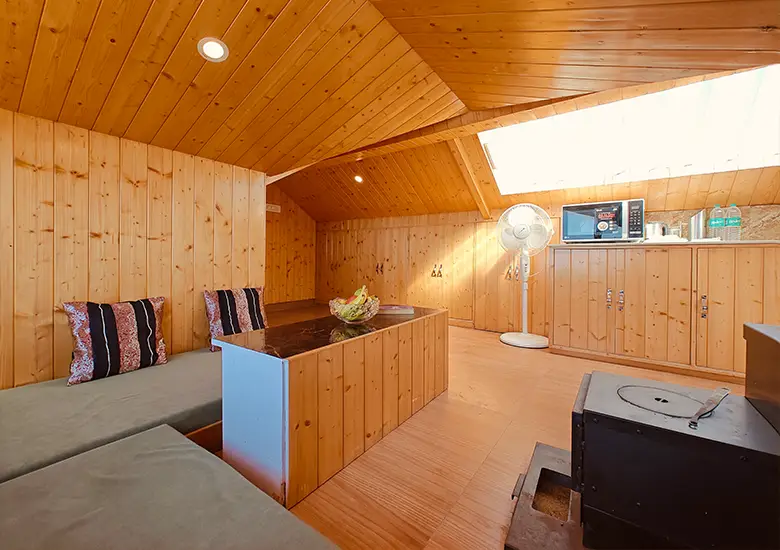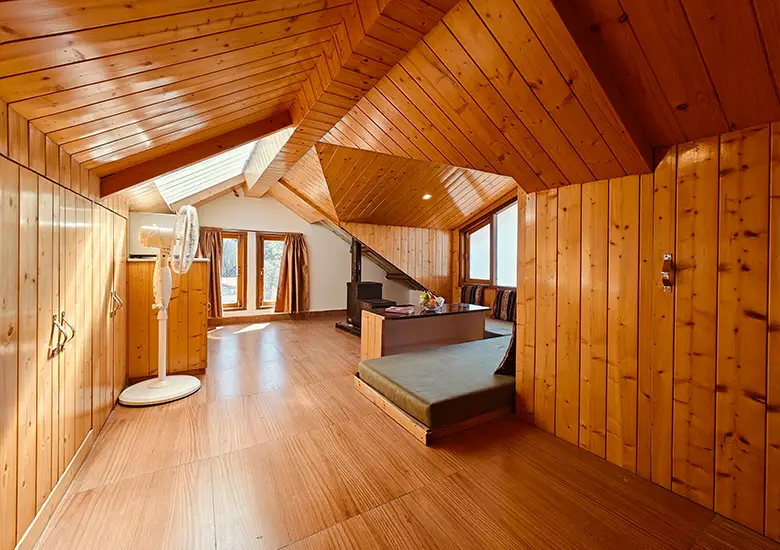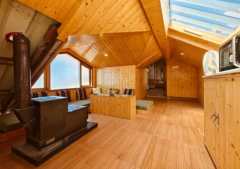 Perfect for families and long-stay guests, our Luxury Apartment occupies a charming attic space designed for comfort and mountain living. The apartment features two bedrooms, a dedicated workstation, a cosy seating area, and large windows that frame sweeping valley views. A fully equipped kitchen with a microwave, fridge, kettle, and woodstove adds convenience, while the LED TV and single well-appointed bathroom complete this spacious home-style getaway.